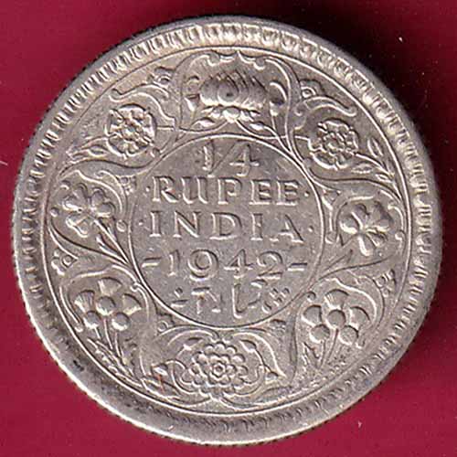BRITISH INDIA 1942 GEORGE VI 1/4 RUPEE BEAUTIFUL SILVER COIN - S1442