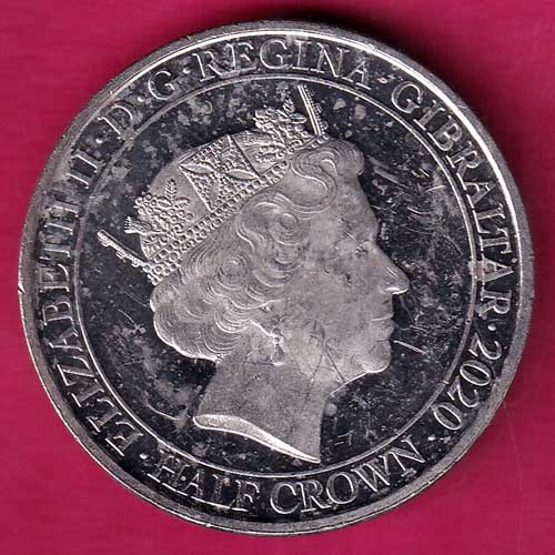 Gibraltar Elizabeth II Sir Winston Churchill with cigar and V-sign date below 1874-1965 Half Crown–@HUB1967