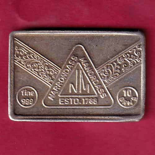 Silver Bar : – Weight – 9.86 gm Narrondass Manordass 10 GMS ESTD .1788 :- S2173