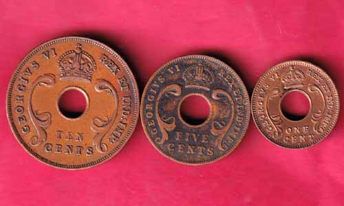 SET:-EAST AFRICA 1942,1943 TEN CENTA,FIVE CENTS,ONE CENTS COINS–@HUB1683